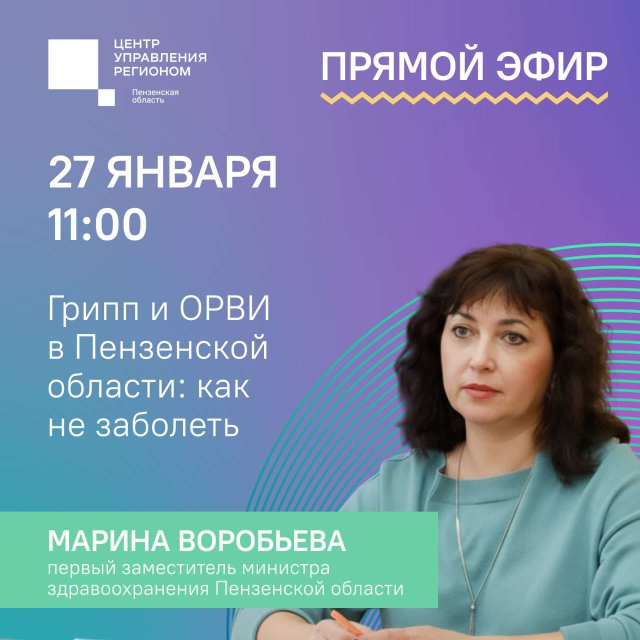 Центр управления регионом проведет прямой эфир с первым заместителем министра здравоохранения Пензенской области Мариной Воробьевой.