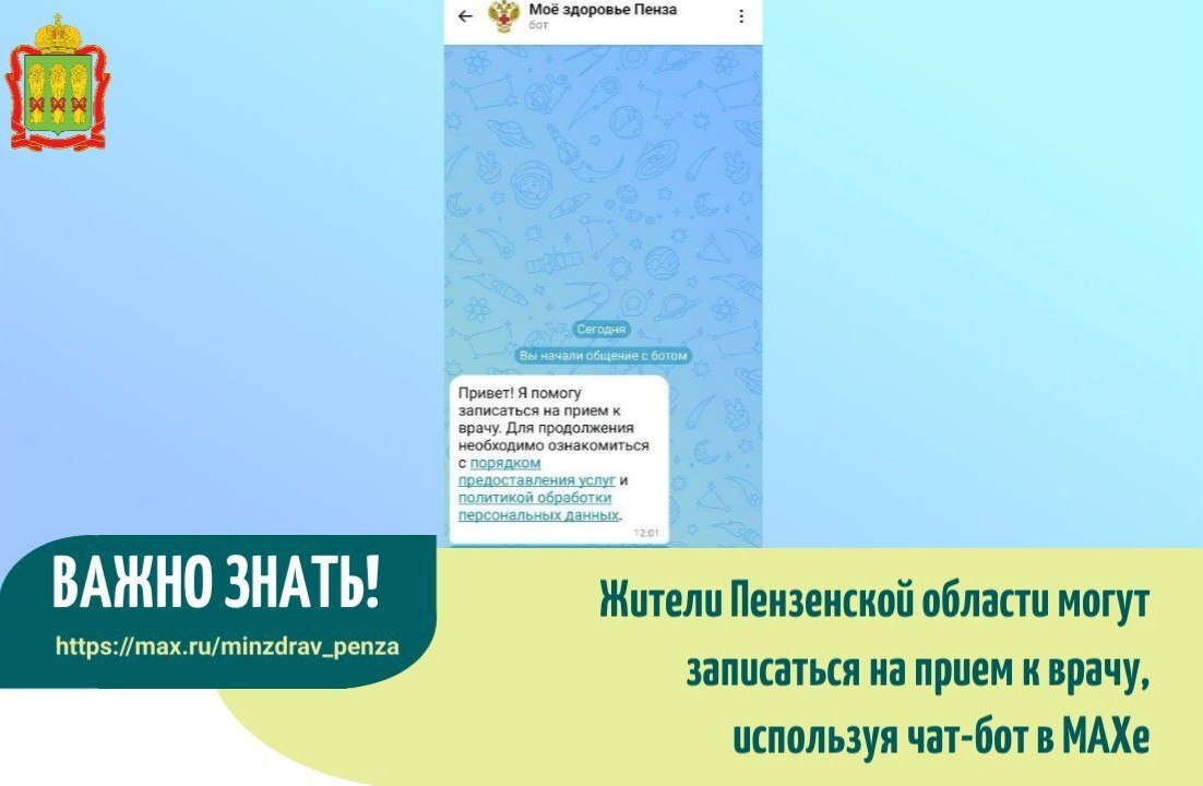 Минздрав Пензенской области запустил в мессенджере МАХ специальный чат-бот «Моё здоровье Пенза» — он поможет быстро и удобно записаться на прием к врачу!