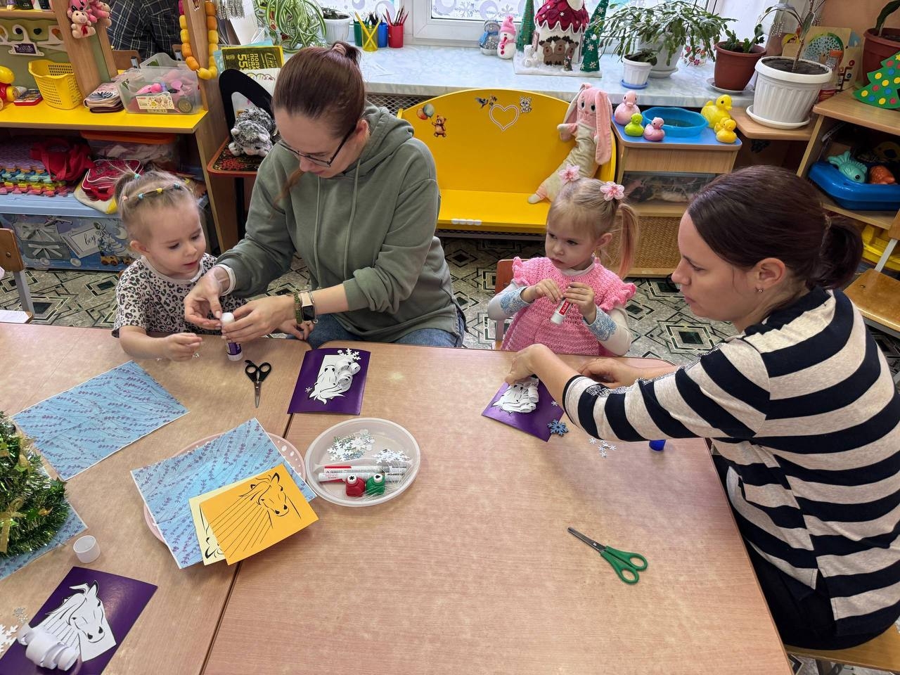 Как же здорово проводить время вместе со своей семьёй! А если проводить это время с пользой, то вдвойне здорово! Малыши, вместе со своими родными, побывали на настоящем мастер-классе по изготовлению новогодней открытки с символом Нового года — лошадкой! В тёплой, семейной атмосфере прошла новогодняя встреча! Ребятишкам доставило огромное удовольствие не только изготовление красивой открытки, но и возможность провести время со своими любимыми мамами и папами!